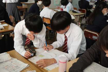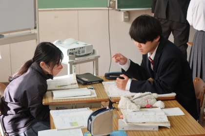 これまでの学習の総まとめとして、章末問題に取り組んでいました。自分から先生や仲間に確認しに行ったり、仲間の困っている様子にすぐに反応して教えに行ったりしています。