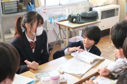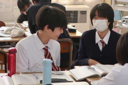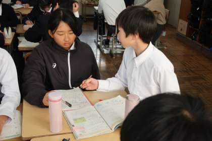 これまでの学習の総まとめとして、章末問題に取り組んでいました。自分から先生や仲間に確認しに行ったり、仲間の困っている様子にすぐに反応して教えに行ったりしています。