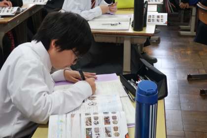 火成岩についての学習です。でき方、特徴などを資料の写真を見ながら丁寧に確認していました。