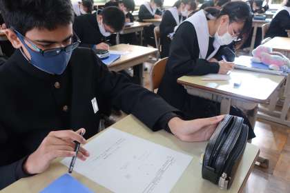『三平方の定理』の学習で、公式に当てはめれば簡単に答えを導き出すことができますが、あえて論理的に問題を解いていく「表現テスト」に取り組んでいました。事前に仲間との意見交流もあり、自分の考えとしてしっかりまとめ上げていきます。