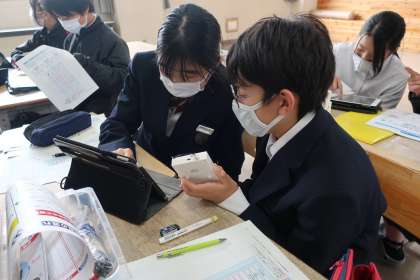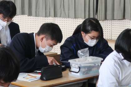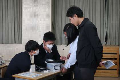 プログラミング学習で、「情報の制御・計測」について、実際にデータを並べ、プログラムどおりに動作が進むか確認していました。