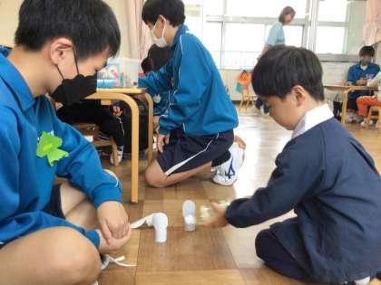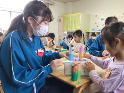 家庭科の授業で園児たちが安全に楽しめるおもちゃをつくり、どんな活動が喜ばれるかをしっかり調べるなど、万全の準備をして実習に臨みました。