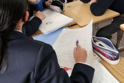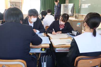 平行四辺形の性質を身につけるため、様々な視点からの証明問題にグループで取り組んでいました。