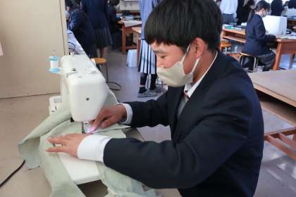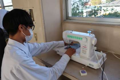 トートバッグづくりに取り組んでいました。いよいよ製品用の生地をミシンで縫い始めました。教科担任のチェックの際は緊張しているようです。