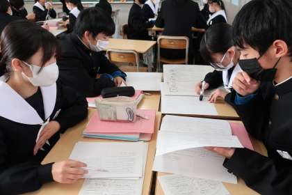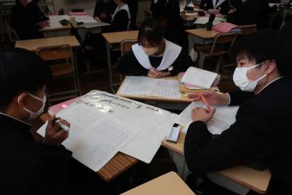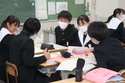 先日取り組んだ学習診断テストの問題を解き直していました。正解を導き出すための解き方のポイントをグループで出し合っていきます。仲間の考え方を参考に、入試本番では納得のいく点数が取れることを期待したいと思います。