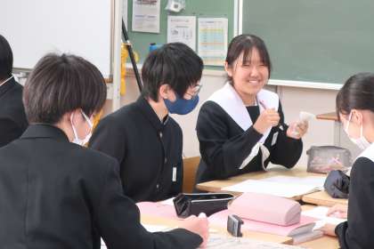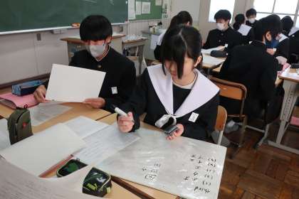 先日取り組んだ学習診断テストの問題を解き直していました。正解を導き出すための解き方のポイントをグループで出し合っていきます。仲間の考え方を参考に、入試本番では納得のいく点数が取れることを期待したいと思います。
