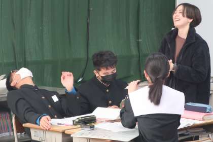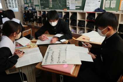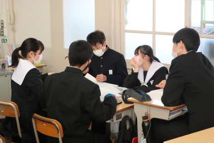 先日取り組んだ学習診断テストの問題を解き直していました。正解を導き出すための解き方のポイントをグループで出し合っていきます。仲間の考え方を参考に、入試本番では納得のいく点数が取れることを期待したいと思います。