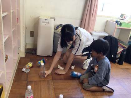 家庭科の授業で園児たちが安全に楽しめるおもちゃをつくり、どんな活動が喜ばれるかをしっかり調べるなど、万全の準備をして実習に臨みました。