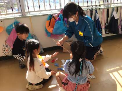 家庭科の授業で園児たちが安全に楽しめるおもちゃをつくり、どんな活動が喜ばれるかをしっかり調べるなど、万全の準備をして実習に臨みました。