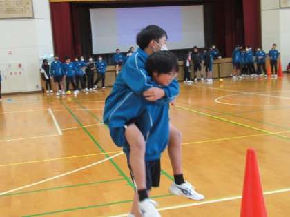 クラスの絆を確かめ合い、学年全員のつながりを実感する学年レク・1年生の様子です。