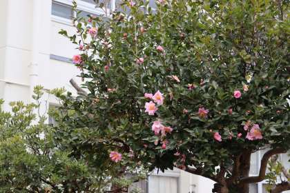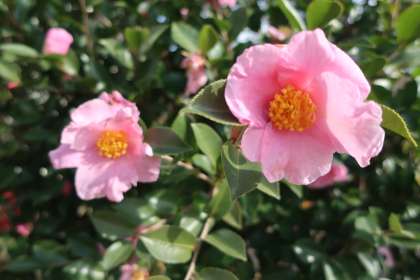 職員室前の植え込みに咲くサザンカ(山茶花)です。他の花が咲かない寒い冬の時期に鮮やかなピンク色で咲くサザンカは、ひと際目立って見えます。
