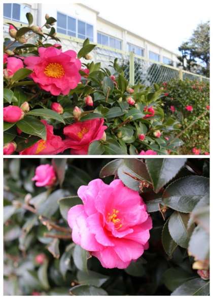 校内ではツバキの花があちこちで咲き乱れ、冬の寂しい景色の中でも、生徒たちを迎える準備を整えてくれています。