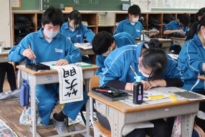 本日の2・3時間目に行われた書き初め大会・2年1組の様子です。