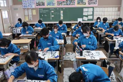 1/7 2-4 真剣に用紙と向き合って… 3 公開日 2025/01/07 更新日 2025/01/07 各学年から 本日の2・3時間目に行われた書き初め大会・2年4組の様子です。 2年生の題目は「笑門来福」。 周囲に福をもたらせるよう、笑顔の多い一年にしてほしいと思います。 長期の休業明けであっても集中力は抜群で、一生懸命用紙に向かっていました。