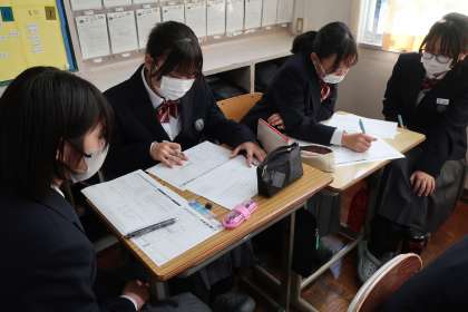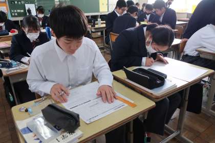 今月末に実施される『学習診断テスト』。それに向けた冬休みの学習の定着具合を確認するため、仲間の考えも参考にしながらプリントに取り組んでいました。