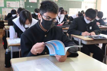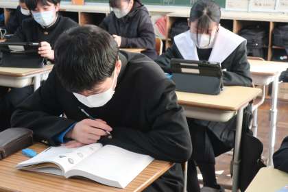 冬休み中の学習の成果を確かめるため、テキストやプリント、学習用タブレットのアプリに取り組んでいました。