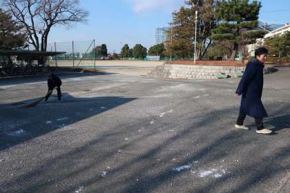 本校でもその対策として、凍結防止剤を散布しました。登校時に使用する東門付近や陸橋の階段には特にしっかりとまきました。