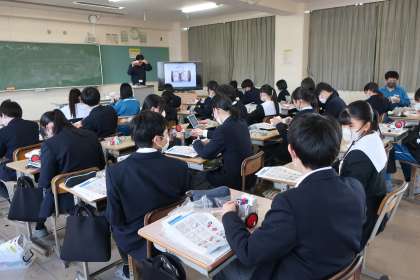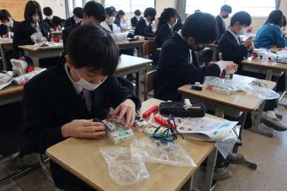 プログラミング学習の単元で、冬休み前に学習した「情報の制御・計測」の内容を思い出しながら、キットにプログラムを読み込ませていました。