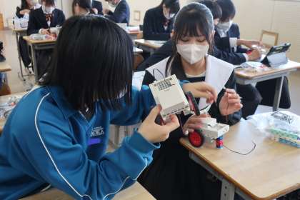プログラミング学習の単元で、冬休み前に学習した「情報の制御・計測」の内容を思い出しながら、キットにプログラムを読み込ませていました。