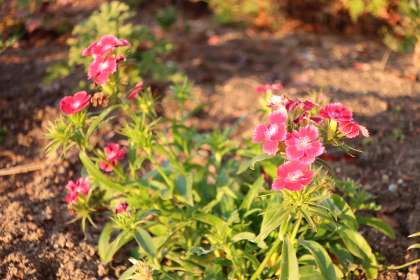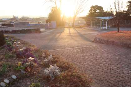 職員室前の花壇は春用の苗に植え替えられていますが、そうでない花もあります。そのうちの一つがナデシコ。濃いピンクに小さな花が、寒さに負けずしっかりと咲いています。朝日に照らされ、ひと際目立って見えます。