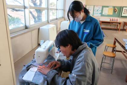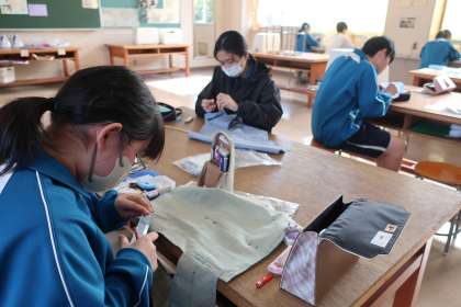 1年4組の家庭科の授業の様子です。 トートバッグづくりに取り組んでいました。