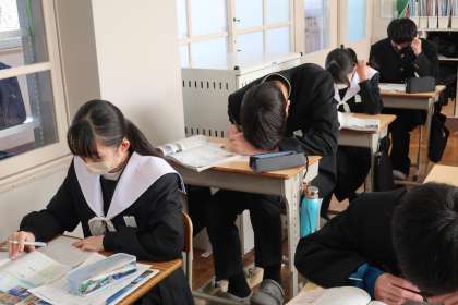 1/17 3-1 学習内容を思い出す 2 公開日 2025/01/17 更新日 2025/01/17 各学年から 3年1組の社会・公民分野の授業の様子です。 ノートや教科書で学習した内容を確認しながら、単元のまとめのプリントに取り組んでいました。