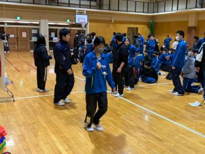 最後の競技は学級対抗リレー。お玉でピンポン玉を運んだり、グルグルバットや縄跳び、サイコロの目がクラスの数字になるまで振り続けるなどの種目で競い合っています。