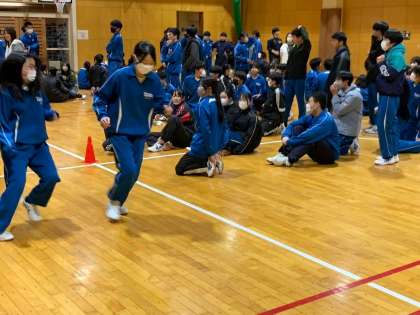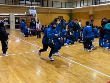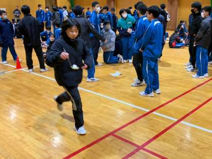 最後の競技は学級対抗リレー。お玉でピンポン玉を運んだり、グルグルバットや縄跳び、サイコロの目がクラスの数字になるまで振り続けるなどの種目で競い合っています。