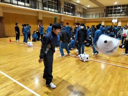 最後の競技は学級対抗リレー。お玉でピンポン玉を運んだり、グルグルバットや縄跳び、サイコロの目がクラスの数字になるまで振り続けるなどの種目で競い合っています。