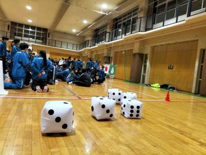 最後の競技は学級対抗リレー。お玉でピンポン玉を運んだり、グルグルバットや縄跳び、サイコロの目がクラスの数字になるまで振り続けるなどの種目で競い合っています。