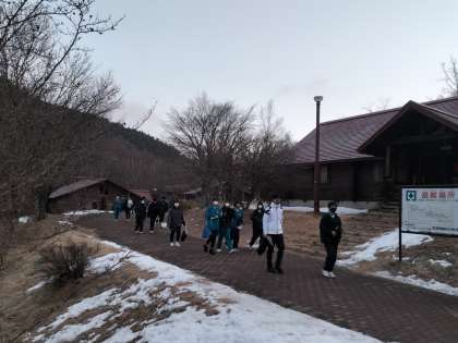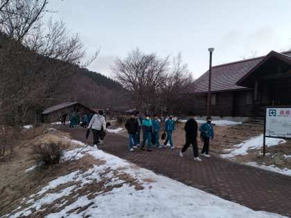 朝のつどいに参加するため、生徒たちが宿泊棟からホールに移動してきました。