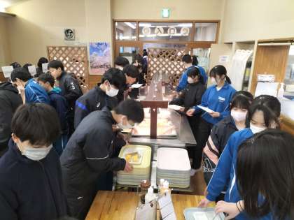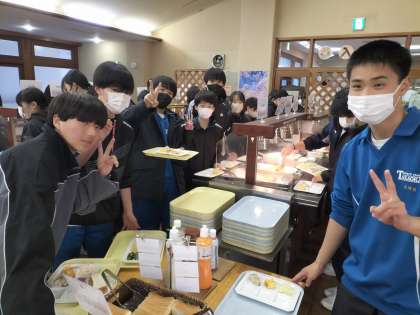 朝食の様子です。 体調不良の生徒もおらず、全員が楽しく会食しています。