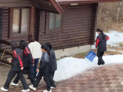 朝食後からスキー実習に出発するまでの時間、宿泊棟の清掃をしたり、荷物整理をしたり、雪?氷?遊びをしたりしています。