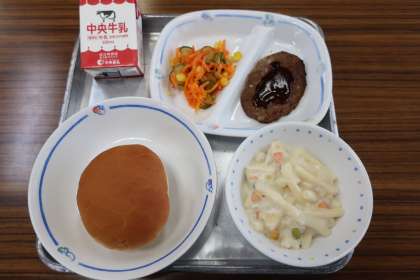 マカロニのクリーム煮、キャロットサラダ、ハンバーガー、牛乳 でした。