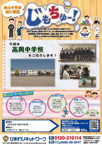 1/27 じもちゅー 放送開始! 公開日 2025/01/27 更新日 2025/01/27 校長室から 本日より、ひまわりネットワーク「じもちゅうー」で、本校の様子が放送されます。 ■ 放送スケジュール 1月27日(月) 13:15 18:45 1月28日(火) 13:15 1月29日(水) 13:15 1月30日(木) 13:15 1月31日(金) 13:15 18:45 *ぜひご覧ください。