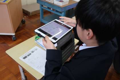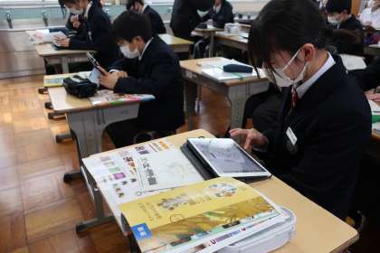「シンボルネームのデザインと配色を決めよう」をテーマに、タブレットを活用して作品づくりに没頭していました。