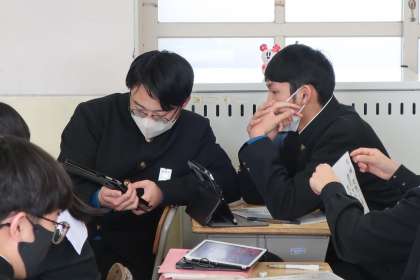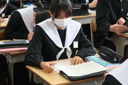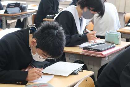 「いにしえの心を受け継ぐ」の学習で、想いを込めた自作の和歌をその意味も紹介しながら清書していました。