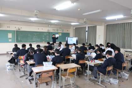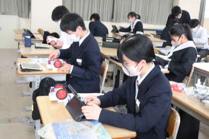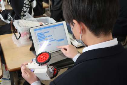 プログラミング学習の単元で、冬休み前に学習した「情報の制御・計測」の内容を思い出しながら、キットにプログラムを読み込ませていました。