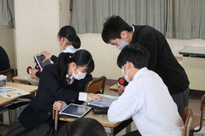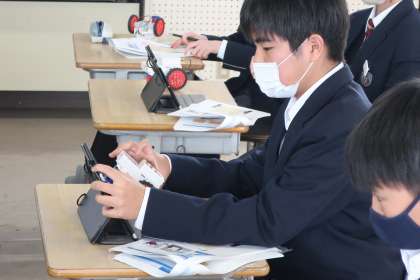 プログラミング学習の単元で、冬休み前に学習した「情報の制御・計測」の内容を思い出しながら、キットにプログラムを読み込ませていました。