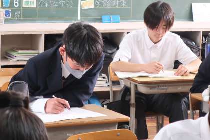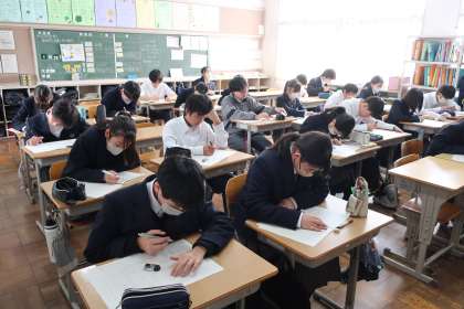 1/29 1-4 本番と同じ集中力 3 公開日 2025/01/29 更新日 2025/01/29 各学年から 1年4組の数学の授業の様子です。 学習診断テストに向け、本番と同じ集中力で対策プリントに取り組んでいました。