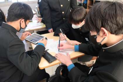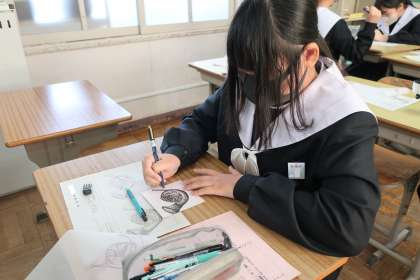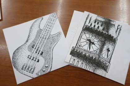 中学校での印象的な場面をイラストにし、点描で仕上げた作品を万年カレンダーにはめ込んでいきます。一心不乱に点を打っている様子に感心しました。