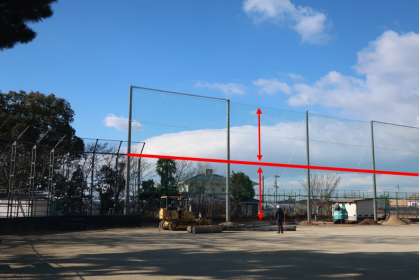 今週月曜日から始まっているバックネット付近の防球ネットの拡張工事。これまでの高さが赤のラインだったため、2倍の高さのネットが張られることになります。