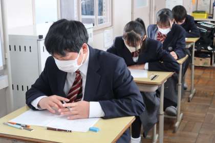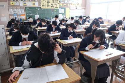 一年間のまとめのテストとして、授業で繰り返し対策プリントに取り組んできたこと、家庭でもしっかり勉強してきたことを出し切ってほしいと思います。