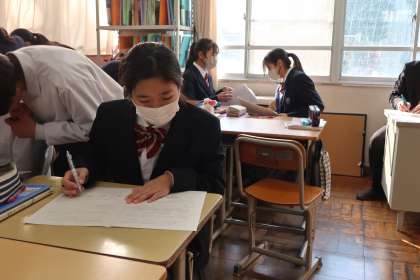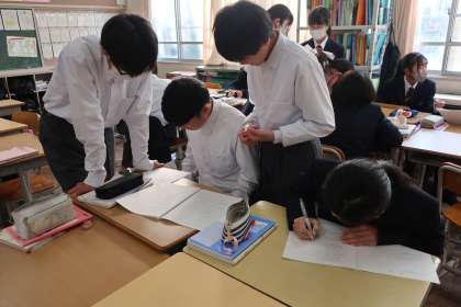 昨日実施された学習診断テストの自身の解答を見直し、解き方に問題がなかったか、正確でさらに早く解ける方法はないかなど、仲間同士で確認し合っていました。