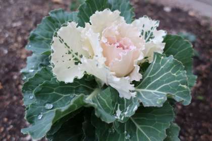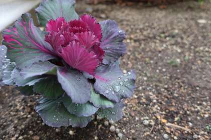 大きな葉を広げ、たくさんの雨を拾い集めていたり、葉の表面で水の玉を作って転がせたり・・・。冷たい雨の季節ですが、寒さに強いハボタンを見ていると、その雨すら楽しんでいるように感じます。
