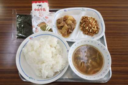 あおさ汁、肉じゃが、納豆、手巻きのり、ひまわり型クッキー、ごはん、牛乳 でした。