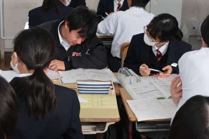 立体の体積比についての学習で、答えの導き出し方を仲間に伝える場面が多くありました。
