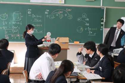 立体の体積比についての学習で、答えの導き出し方を仲間に伝える場面が多くありました。