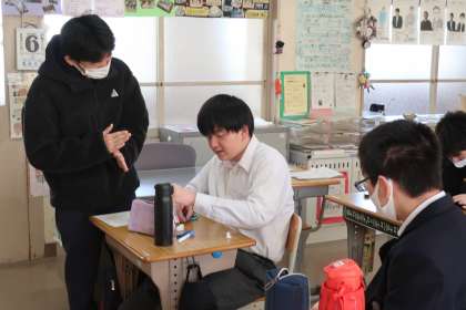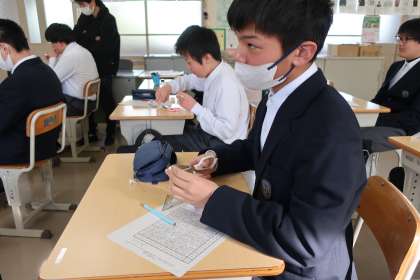 2/6 1,2学級 立体図形を学ぶ 3 公開日 2025/02/06 更新日 2025/02/06 各学年から 1,2学級の数学の授業の様子です。 「切って形を作ろう」をテーマに、黒板に示された図形を実際にスポンジを切って作っていきます。試行錯誤を繰り返しながら、立体図形についてい学んでいました。