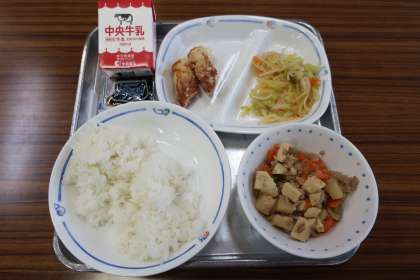 2/19 今日の給食 公開日 2025/02/19 更新日 2025/02/19 特別活動 今日の献立は ————— 高野豆腐のうま煮、切り干しだいこんの酢の物、ちくわの天ぷら、のり佃煮、ごはん、牛乳 でした。 *エネルギー:831kcal たんぱく質:32.3g